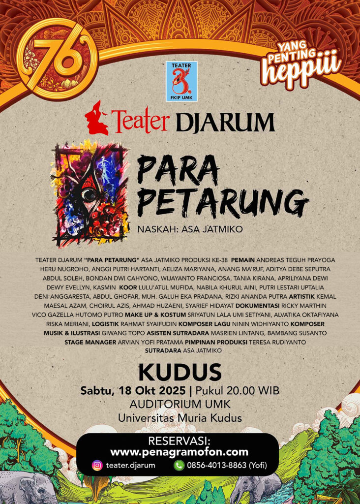 π€ Aktor: Andreas Teguh Prayoga, Heru Nugroho, Anggi Putri Hartanti, Aeliza Mariyana, Anang Maβruf, Aditya Debe Seputra, Abdul Soleh, Bondan Dwi Cahyono, Wijayanto Franciosa, Tania Kirana, Apriliyana Dewi, Dewy Evellyn, Kasmin, Koor: Luluβatul Mufida, Nabila Khurul Aini, Uptalia, Putri Lestari, Deni Anggaresta Marlistian, Abdul Ghofar, Muh. Galuh Eka Pradana. Artistik: Kemal Maesal Azam, Choirul Azis, Ahmad Huzaeni, Syarief Hidayat, Dokumentasi: Ricky Marthin, Vico Gazella Hutomo Putro. Make Up & Kostum: Sriyatun Lala, Umi Setiyani, Alvatika Oktafiyana dan Riska Meriani. Logistik: Rahmat Syaifudin, Purna Irawan. Komposer Lagu: Ninin Widhiyanto, Komposer Musik & Ilustrasi: Giwang Topo. Astrada: Masrien Lintang, Bambang Susanto, Stage Manager: Arvian Yofi Pratama, Pimpinan Produksi: Teresa Rudiyanto.