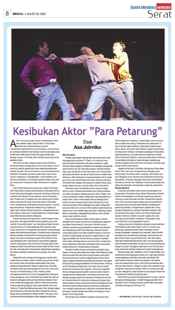 Lakon “Para Petarung” yang saya tulis, tengah dimainkan oleh Teater Djarum dalam pentas keliling 4 kota tahun 2025 ini. Empat kota yang disinggahi, antara lain: Surabaya, Bandung, Surakarta dan berakhir di kota asalnya; Kudus. Dimainkan oleh 10 aktor dan 10 anggota koor, dan didukung tim artistik tidak kurang dari 20 orang. Kelompok teater ini berusaha untuk menghadirkan serangkaian proses yang baru, minimal bagi personelnya. Pada proses sebelumnya, misalnya di dalam lakon “Petuah Tampah” para aktor mengeksplorasi properti masing-masing dan menghidupkannya menjadi bagian yang tidak terpisah dari laku aktingnya.