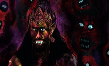 RAHWANA: Kanjeng Ibu, Rahwana minta maaf. Semua sudah hancur, Ibu. Rahwana tidak bisa menyelamatkan Alengka lagi.