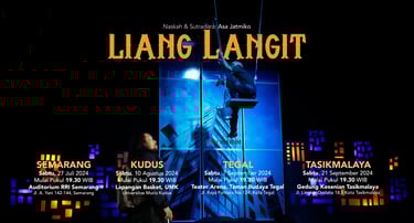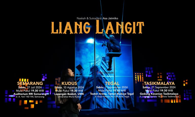 PANGGUNG YANG SEMULA GELAP KEMUDIAN PERLAHAN MEMPERLIHATKAN LANGIT TENGAH DUDUK SEORANG DIRI, TERGANTUNG-GANTUNG DI KETINGGIAN PADA SEBUAH “ACCESS ROPE” - LEBIH MIRIP SEPERTI AYUNAN. CAHAYA HANYA JATUH KE WAJAH LANGIT, DAN DI SEKELILINGNYA GELAP.