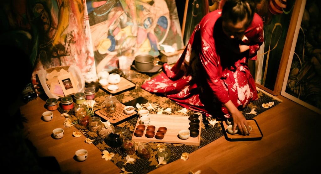 SARASVATI tumbuh dari hasrat untuk menyatu: antara rupa dan rasa, antara yang personal dan yang publik, antara tubuh dan cerita. Di dalamnya, tiap individu tidak hanya tampil, tapi saling menampung. Teh bukan hanya minuman, tapi perantara keintiman. Lukisan bukan sekadar visual, tapi jalan sunyi menuju batin. Tubuh bukan sekadar alat, melainkan teks yang bergerak. Puisi, dongeng, performans, dan warna—semuanya menari dalam satu tarikan napas.