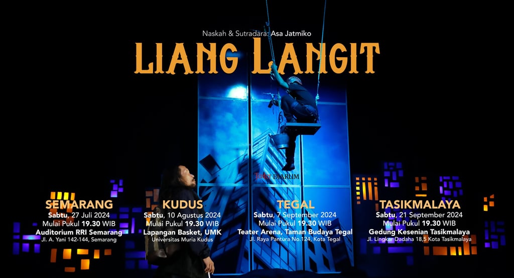 Pertunjukan teater di 4 kota, yakni: Semarang (27/7), Kudus (10/8), Tegal (7/9) dan Tasikmalaya (21/9) ini berjudul “Liang Langit”. Naskahnya saya tulis dengan sebuah ajakan pendekatan teknik ‘thriller’ di beberapa adegan, yang bertujuan mendapatkan efek kejut untuk penonton. Tata artistik ini tidak hanya dimaksudkan sebagai atraksi semata, namun juga dapat dimaknai sebagai simbol-simbol pertarungan jagat batin seorang manusia Langit. Visual dramatik ini merupakan tawaran gagasan pemanggungan, berkelindan dengan alur cerita ‘plot-twist’. Ketegangan, frustasi, kemarahan, ketakpastian diaduk, untuk kemudian menjadi sebuah peziarahan seorang manusia dalam menemukan hidup yang bermakna untuk dirinya. Sebuah liang menuju “langit”, haribaan Ilahi.
